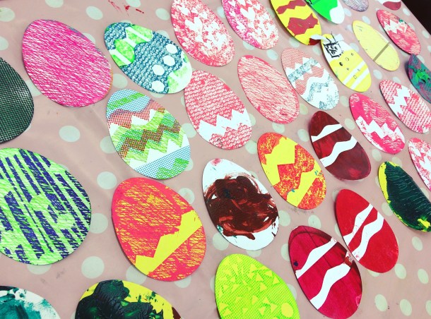 We’re taking a little break at INTRA over the Easter weekend, but will be opening again as normal on Tuesday 18th. In the meantime we hope you like the display of decorated eggs in our window. These were made by our home education groups, using screen printing, vinyl stickers and relief printing to decorate the egg shapes. We hope you have a lovely Easter and can join in with some creative activities with us soon.