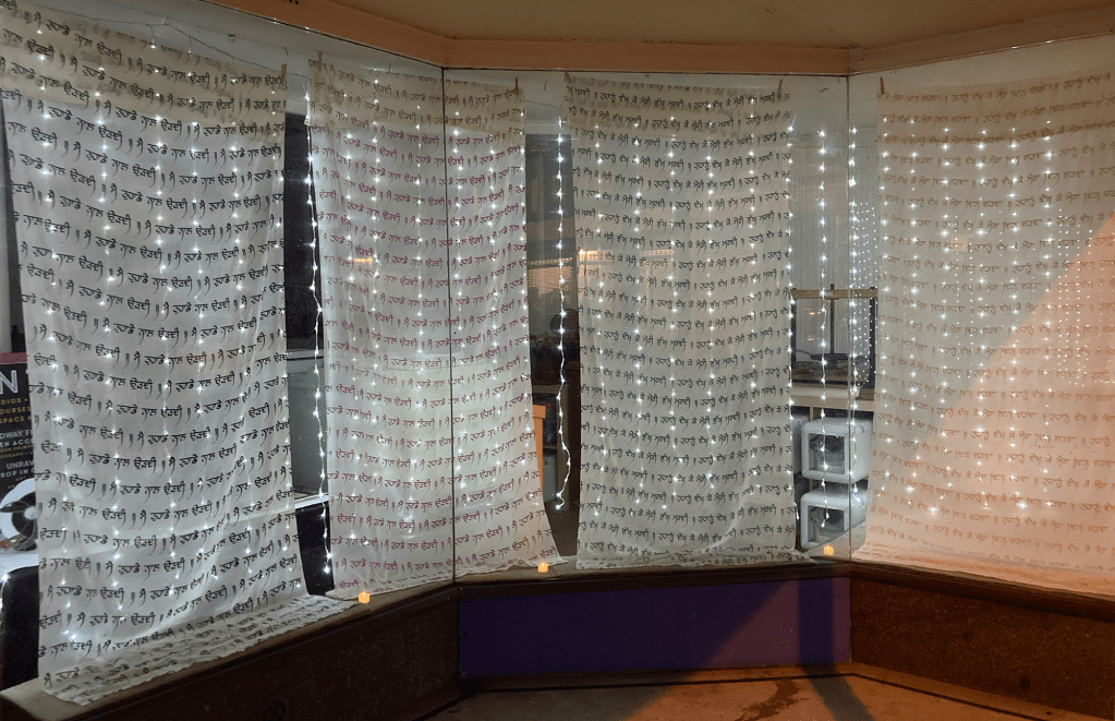 Happy Diwali! Our window gallery is lit up with a beautiful new installation by Jas Dhillon – cotton choonis (dupattas/shawls/scarves) screen printed using Punjabi text and hung against a backdrop of fairy lights in keeping with the Indian festival of lights.
