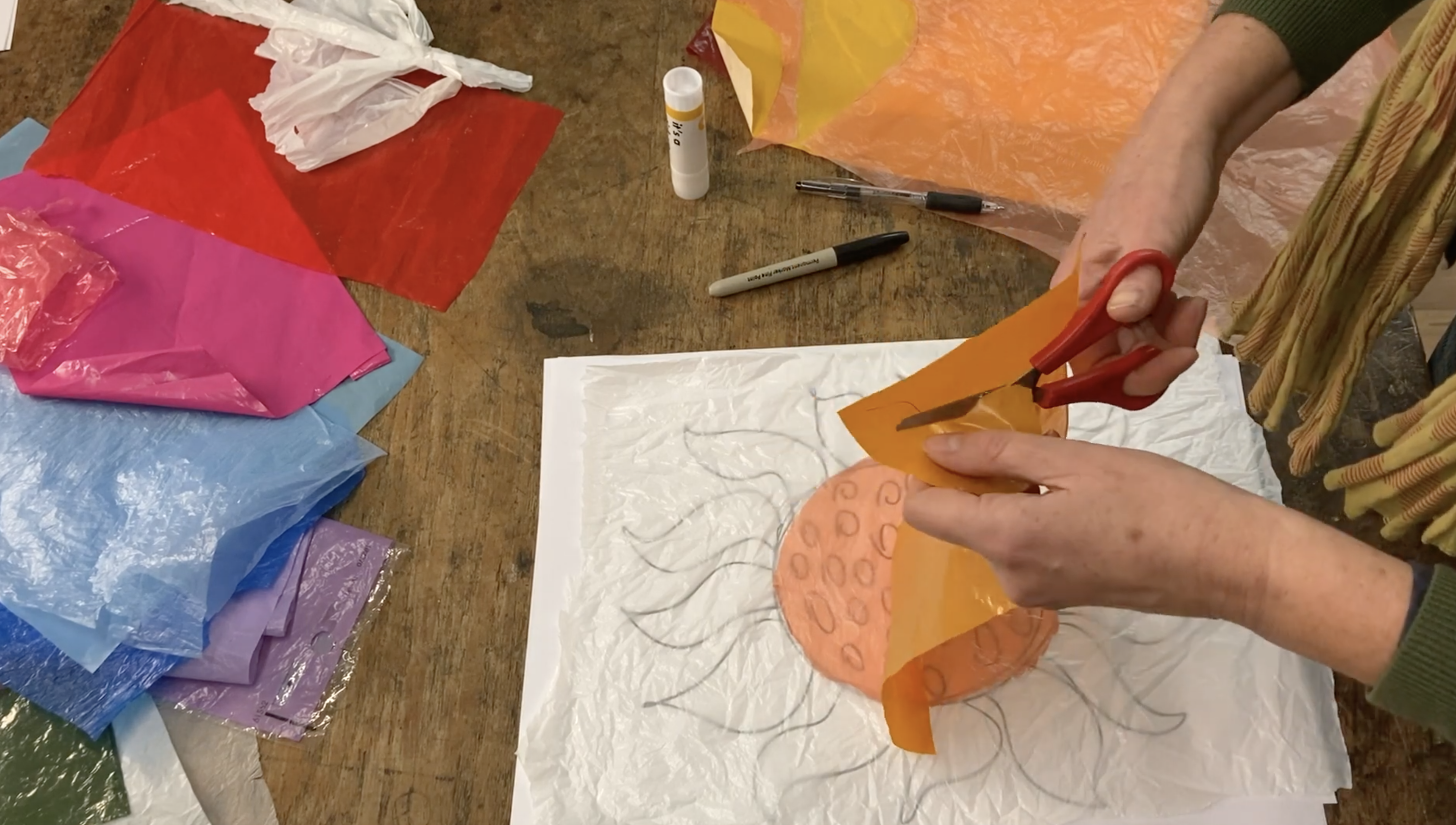 These collages look lovely when back lit, and will provide cheering decorations that will grow and be added to as more people get involved in the project. All you need is a glue stick, scissors and some plastic bags. Xtina will fuse the finished pictures with other layers of plastic to make them strong, then use them in the creation of large lanterns.