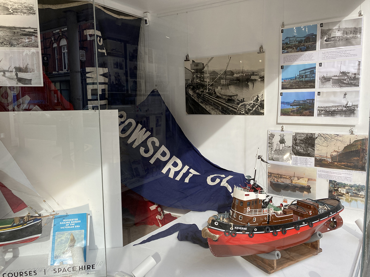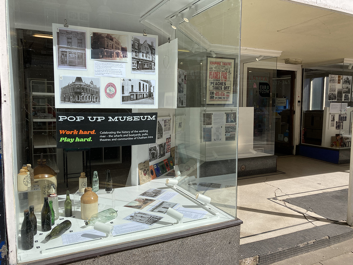 We’re delighted that our launch exhibition is getting a lot of attention from passers by on the high street. ‘Pop Up Museum‘ is a collaboration between Robert Flood and Kevin Younger, and their theme ‘Work Hard, Play Hard’ celebrates the history of the working river – the wharfs and boatyards, pubs, theatres and communities of the area on our doorstep, traditionally known as ‘Chatham Intra’.
