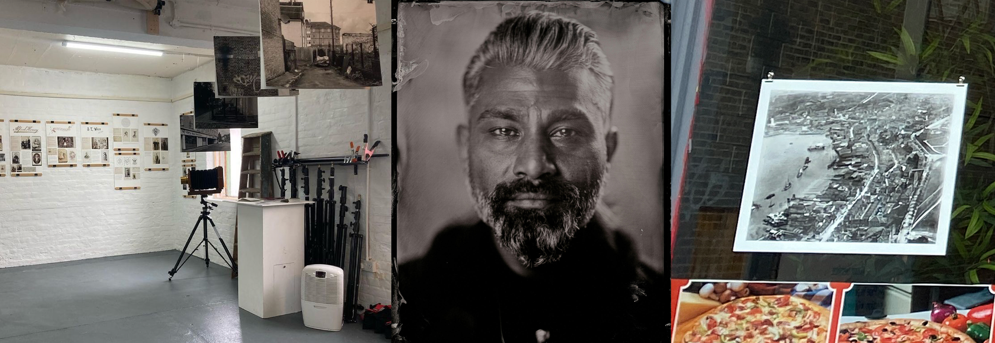 The photographic studios were the focus of photographer Rikard Osterlund‘s commission. He created a series of panels detailing Victorian studios and their work, and these appeared in shop windows at their historic locations. Rikard also created an installation of the panels at his own workplace, Hulkes Lane Darkroom & Studio, as well as a zine documenting the studios. One of Rikard’s specialities is portrait photography using a Victorian process called wet plate collodion. We were very lucky to have this spectacle on show at Ebb & Flow, as through the weekend he ran dozens of sessions with local residents and business people to capture their image in unique photographs made directly onto tin plates.