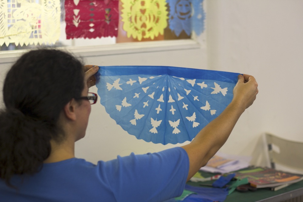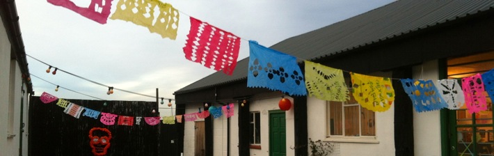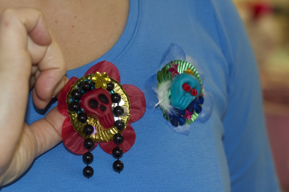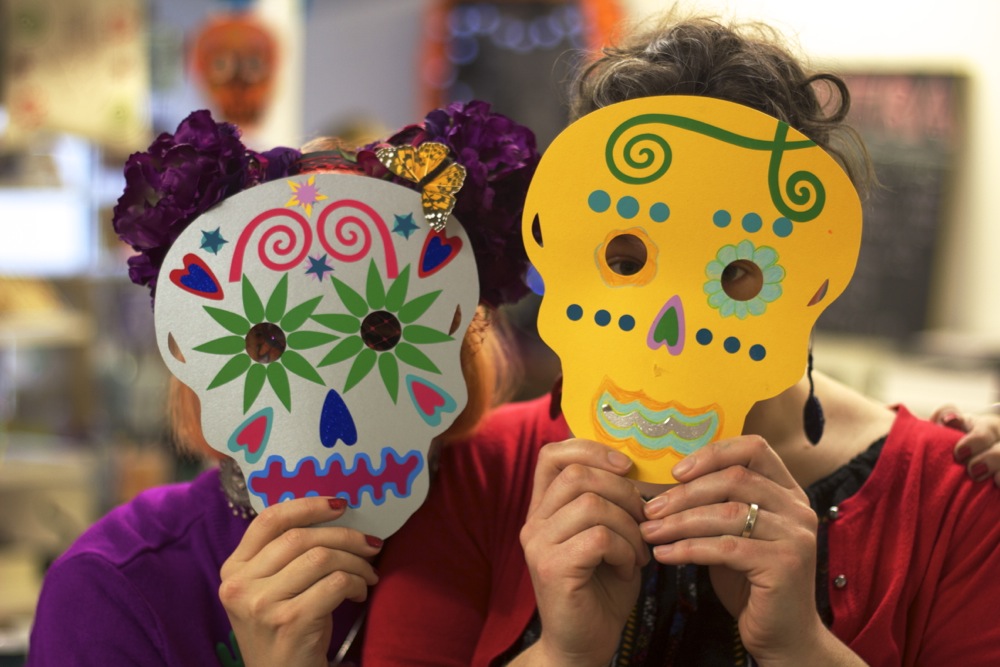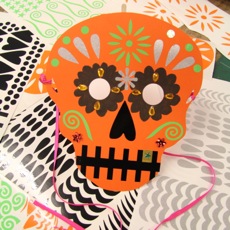 Children as young as 3 years have managed to take part if given lots of help with things like screen printing on bags. They’ve also managed making little decorated luggage label ‘shrine tags’ in memory of a beloved family member or pet who has passed on. You just have to choose bits and stick them on. The same for the skull masks, if you can stick on stickers you can do that activity. Making jewellery, cutting tin decorations, and the papel picado banners are more suited to older participants who can work safely with sharp tools.