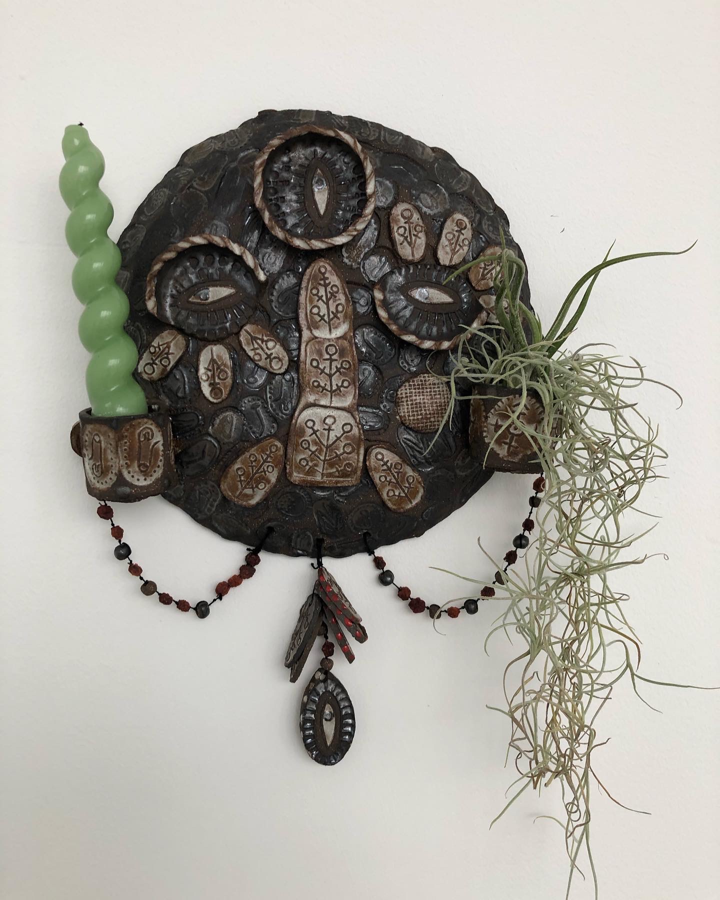 Alongside these works, Rachael’s genderqueer deity sculptures protect us from gender conformity and those who would attack the rights of women, womxn and all of those with less power than the ruling elites. There is hope in this work, a reminder that queer joy is vital to sustain us, and the hand drawn tiles extend an invitation to those we wish to welcome into our lives, cats, queers, artists, witches, crones and more.