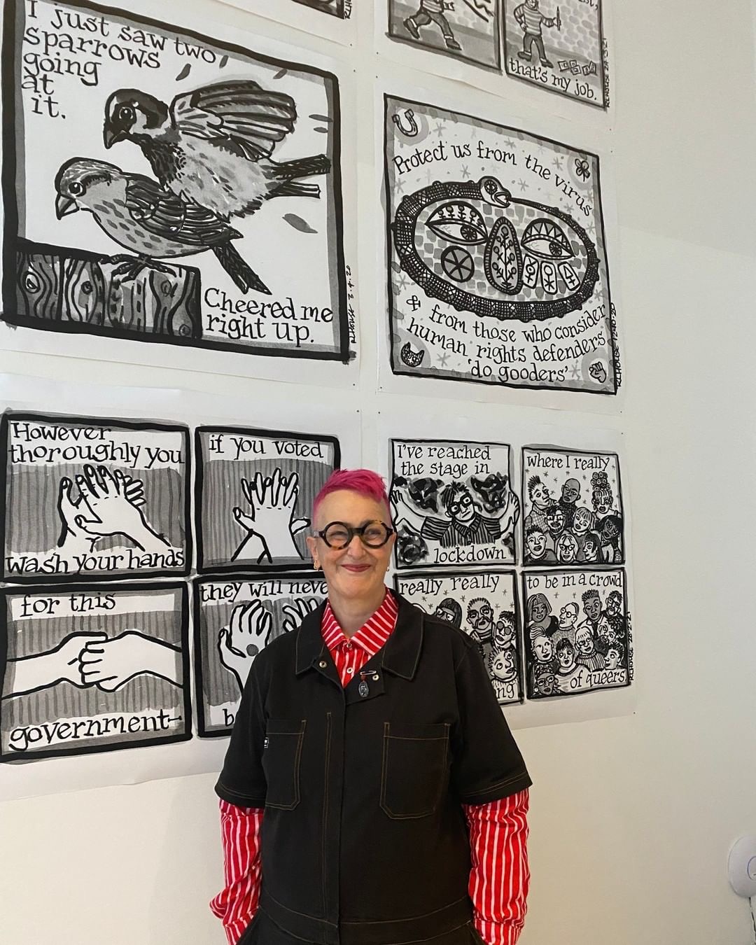 During the first year of the current pandemic, unable to make her planned work on a residency with Metal Peterborough, Rachael documented the political, social and emotional impact of what was happening in comic strip form. Initially posted on Instagram, these drawings became a book ‘Resistance Sustenance Protection‘ (with support from Arts Council England and Metal Culture). The prints in this exhibition are works from this book.