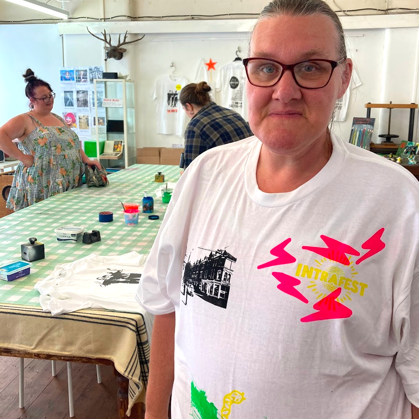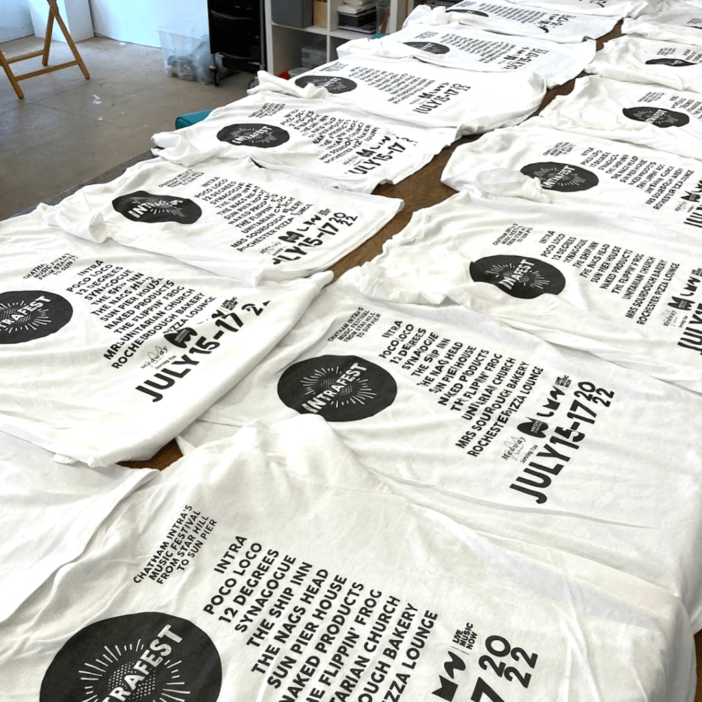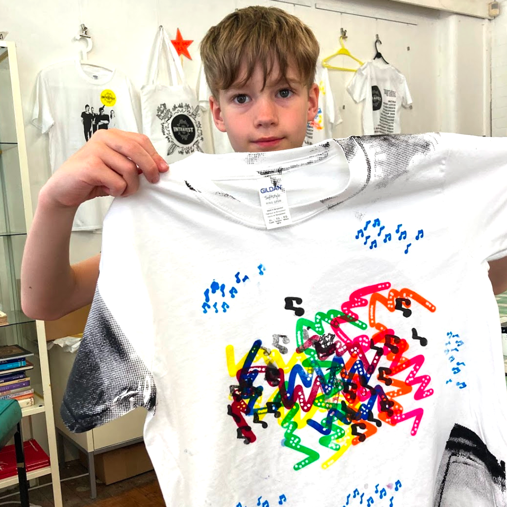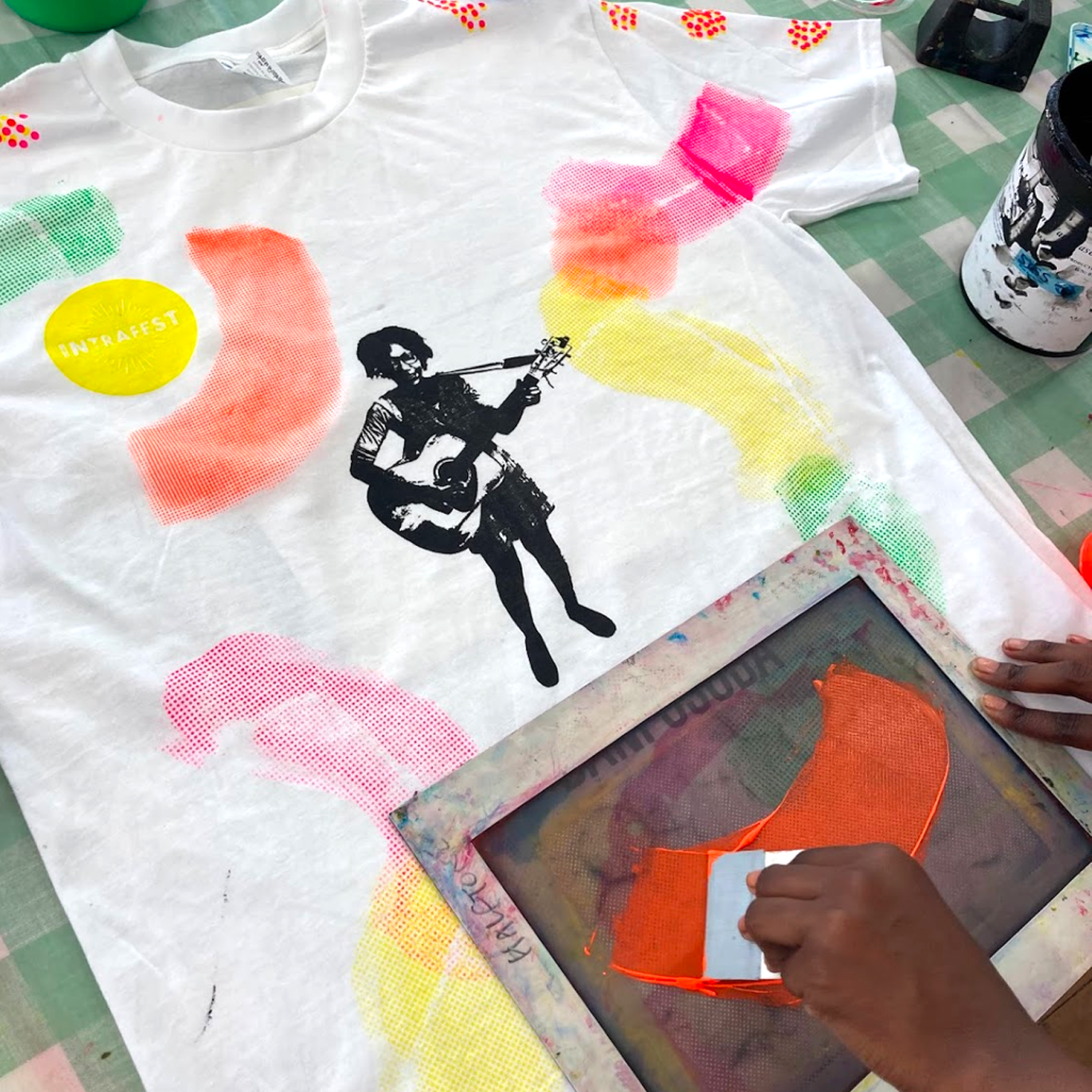 As well as watching great bands play all along The Old High Street Intra, festival visitors took the opportunity to screen print their own IntraFest band T-shirts with us on the evening of Friday 15th July at our Drink, Dance & Design workshop, and we ran a family friendly version in the daytime too.