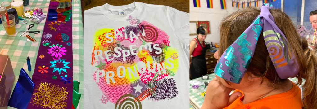With ‘Shiny, Printy Pride Drinkies‘ night, we got everyone wildly screen printing textile accessories with foil screen prints and making slogan T-shirts, while drinking delicious cocktails made by a pop-up Poco Loco bar, and listening to a Pride playlist.