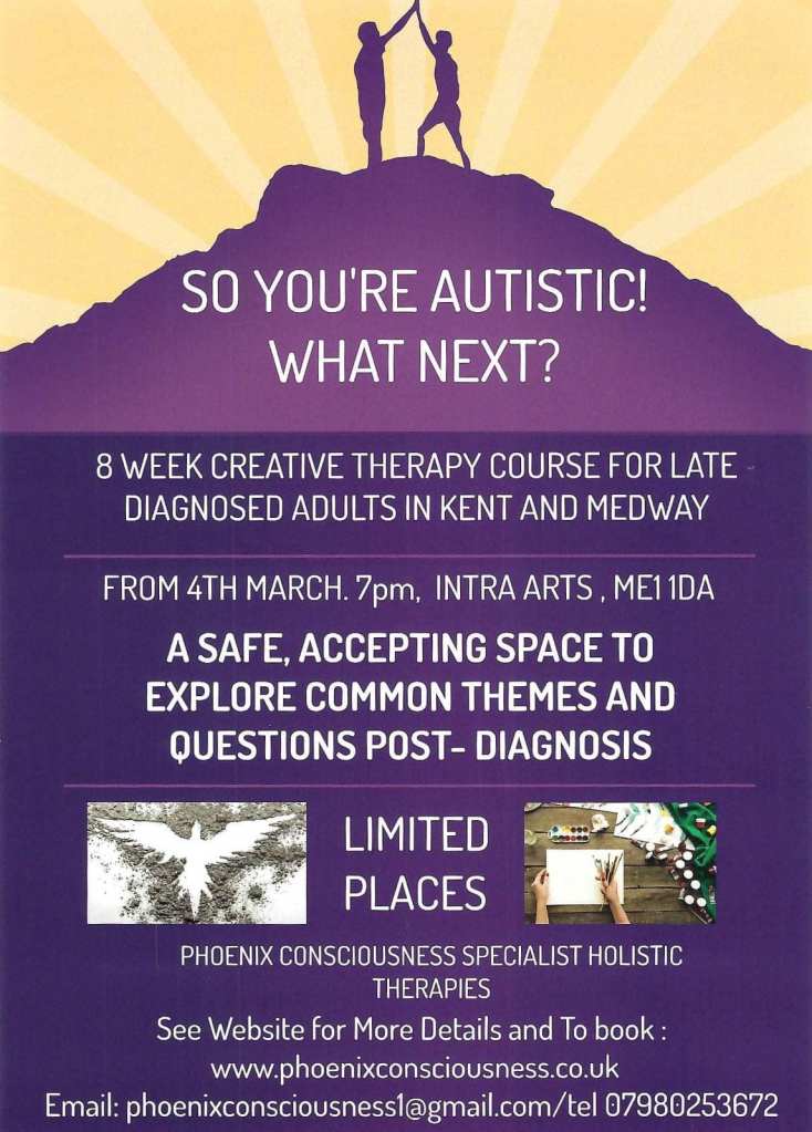 Hello all late identified autistic adults in our local community! If you felt like there was a lack of support after discovering you were autistic; if you are still processing what autism means for you or need some time and a safe, accepting space to explore common issues and questions about self- image, masking, relationships, sensory overload, emotional regulation, previous misdiagnosis or reflections on the past, I am running some creative therapy sessions for a small group over March and April.