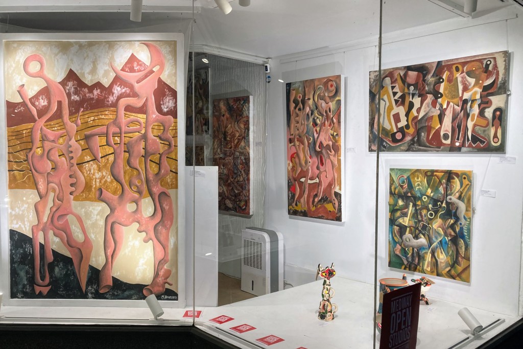 We do lots of things at Intra Arts, and the people that usually come to us have booked courses, printmaking or glass art sessions to use the equipment that lives in our building, or joined us for projects such as The Cut Of Her Cloth, or festivals like Pride Fringe or Ebb & Flow, or come for a look at the exhibition currently in our windows. We also work with a lot of fantastic artists, so during MOSAF, it makes sense to showcase the projects we’ve been working on, the facilities available with us, and the work of artists we love. Here’s the round up of what was on offer for the July 2024 Open Studios at Intra Arts. To see the entire line up of artists across venues through Medway, take a look at this year’s festival brochure.