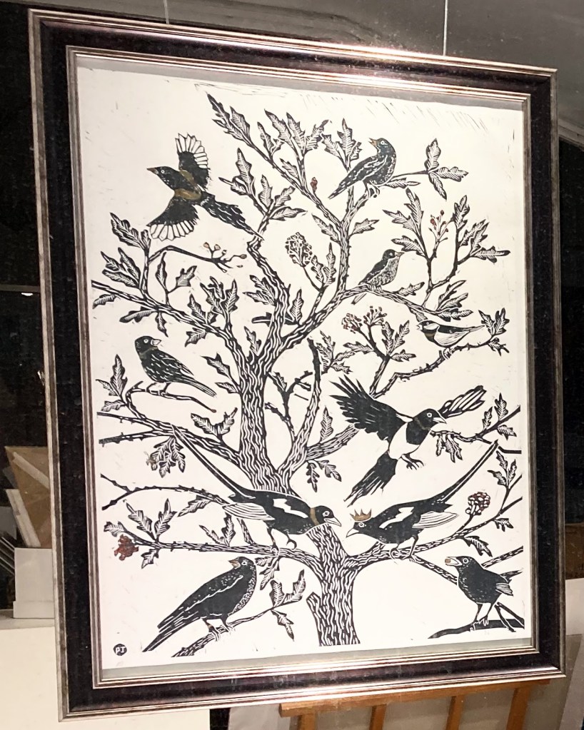 A regular for Open Access sessions, Paul was showing people around the etching press room, where he was working on a set of prints featuring (sort of) friendly giants Gog and Magog, guardians of the City of London. There were also plenty of his familiar linocut themes of birds, the folk calendar, and exploits of various critters on show, as well as a selection of his green man design ceramics.